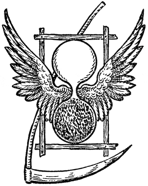 A foice às vezes simboliza a morte na ampulheta. A morte interrompe a vida e nos leva à eternidade. Mostra que, mesmo que consigamos vencer males desde a infância até a vida adulta, eventualmente o tempo vai alcançar e teremos que deixar o mundo para trás.