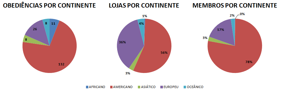 Atualmente, 185 Obediências constam no List of Lodges, abrangendo os cinco Continentes. O Continente Americano atualmente concentra 71% das Obediências reconhecidas internacionalmente, 56% das Lojas Maçônicas do mundo, e 78% dos maçons regulares.
