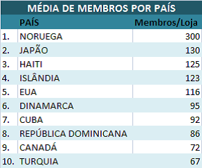 A inversão de posições que se vê entre França e Canadá ocorre por conta da média de membros por Loja. Enquanto o Canadá está entre os 10 países com melhores médias de membros por Loja do mundo, de 72 membros por Loja, a França encontra-se entre as 15 piores, com uma média de apenas 26 membros por Loja. O Brasil, infelizmente, parece ter herdado esse baixo índice da França, apresentando média de 36, a mesma do vizinho Paraguai e abaixo de outros países sul-americanos como Venezuela (43), Uruguai (50), Chile (51) e Bolívia (60).