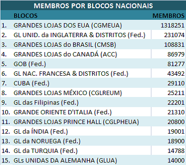 Nessa visão por quantidade de membros por bloco, o Brasil ocupa dois lugares entre os 05 maiores blocos nacionais, com a CMSB, a Confederação das Grandes Lojas Estaduais, em 3º lugar, e o GOB, uma Federação, em 5º lugar. Importante observar que, se os Grandes Orientes Independentes fossem considerados no List of Lodges, provavelmente a COMAB estaria em 7º lugar, acima de Cuba, dando três posições ao Brasil entre os 10 maiores blocos maçônicos nacionais do mundo.