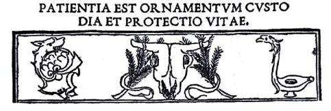 A relação aqui, bem mais simples do que nos Emblemata de Alciato, é de analogia direta entre as palavras e as imagens, de forma que Polifilo as interpreta da seguinte maneira para chegar ao lema PATIENTIA EST ORNAMENTUM CUSTODIA ET PROTECTIO VITAE: o crânio de boi expressa a paciência (patientia), os ramos, o ornamento (ornamentum); o cão, a custódia (custodia); o elmo, a proteção (protectio); e a lâmpada, a vida (vita).