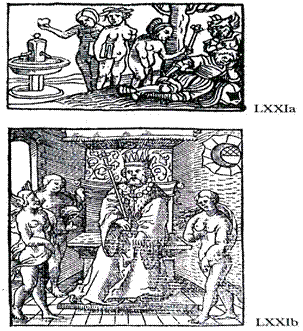 Emblema LXXI:[23] o julgamento de Paris exemplifica os três graus e as três naturezas da Obra. Juno corresponde à natureza mineral e metálica que guarda todos os tesouros, Pallas traduz a natureza vegetal que destrói e regenera os corpos e Vênus encarna a natureza animal e sua força vital. O pomo de ouro seria a pedra filosofal (MAIER, 2016). O motto diz: “Sobre o estudioso perdido de amores”.