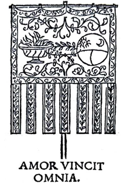 Trata-se de um dos inúmeros “hieróglifos” inventados por Colonna que, na sua época, foram tomados por autênticos, uma vez que teriam sido compilados pelo filósofo estoico, gramático e sacerdote Queremon de Alexandria, que teria vivido no século I d.C. Os hieróglifos de Colonna já antecipam, em certa medida, a lógica do emblema, em especial quando se considera, conforme os estudos de Volkmann, que os emblemas foram tentativas humanísticas de criar algo equivalente aos hieróglifos na Modernidade.[15] No “hieróglifo” acima, as três figuras significam respectivamente as três palavras do lema de Virgílio, AMOR VINCIT OMNIA (Eclogae, 10, 69): o vaso em que há uma chama é o AMOR, o ramo de vime é o VINCIT e o mundo é o OMNIA.