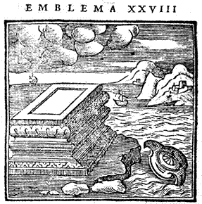 Emblemas são pequenas gravuras – inicialmente, xilogravuras – acompanhadas por um lema (motto) e/ou epigrama (quase sempre em latim) que, contudo, não simplesmente explicam as imagens, com o que suas cargas significativas seriam reduzidas e controladas, mas as abrem para interpretações infinitas, tratando-se de “um casamento ético e filosófico onde se escuta a imagem e se vê a palavra” (GABRIELE, 2009, p. III).[14] O termo latino emblema vem do grego ἔμβλημα, palavra composta que significa “aquilo que é inserido em outra coisa para ornamentá-la”. O primeiro livro de emblemas foi o Emblematum liber de 1531, de Alciato, obra que para certos estudiosos mantém uma secreta relação com a alquimia, mediada por alguns emblemas inspirados pelas Metamorfoses de Ovídio (GABRIELE, 2009, pp. LXIV-LXXII). No Emblematum liber já se pode compreender a diferença entre emblema e símbolo, dado que este ilustra, de maneira direta e unívoca, o que pretende significar. Por outro lado, o emblema é mais obscuro, não havendo correspondência direta e necessária entre o texto e a imagem que o acompanha, exigindo assim um trabalho hermenêutico que, mais do que esclarecer o sentido de determinado emblema, o cria. “Ler” um emblema consiste então em uma atividade criativa e não apenas investigativa, dado que a cada leitura algo novo pode surgir no mundo, confirmando, uma vez mais, que é a repetição que gera a diferença, como ensinou Deleuze.