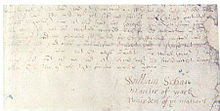 Assinatura de William Schaw em uma cópia do Segundo Estatuto, como “maister de wark” e “wairden of the maisons”, Holyroodhouse , 28 de dezembro de 1599